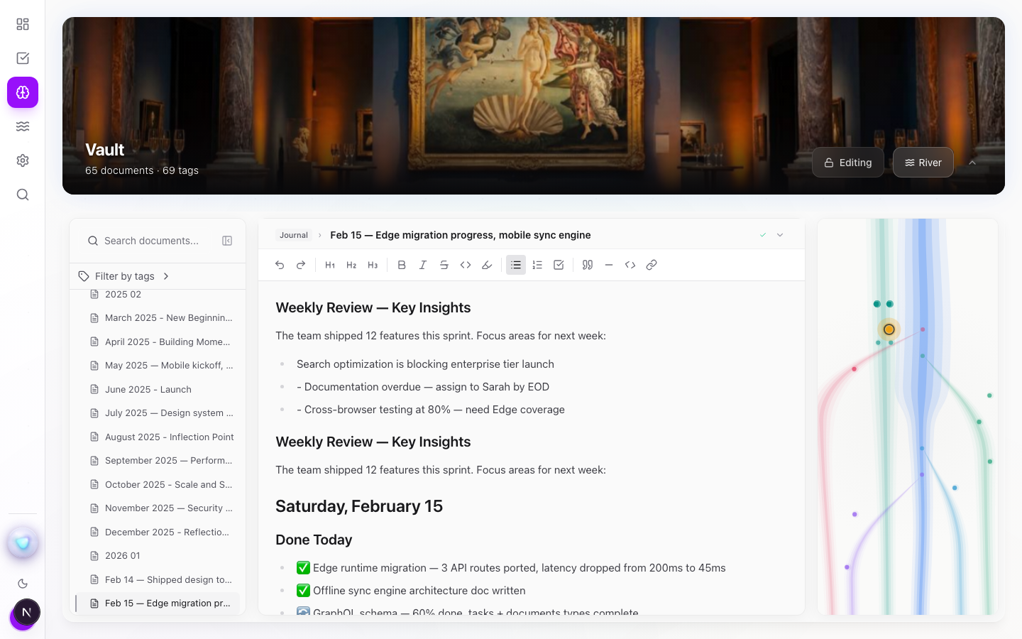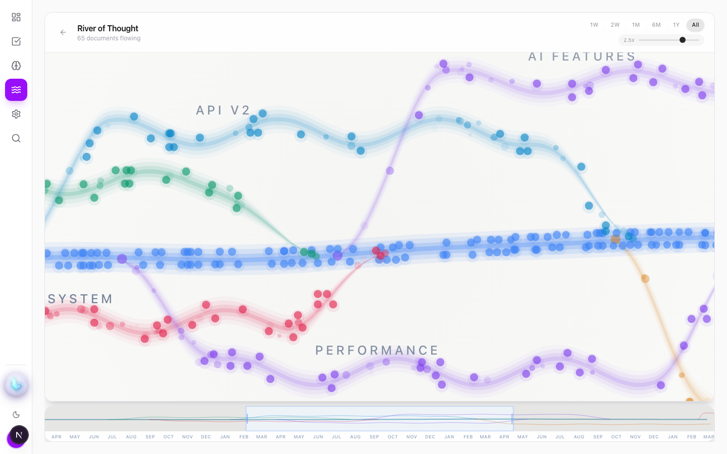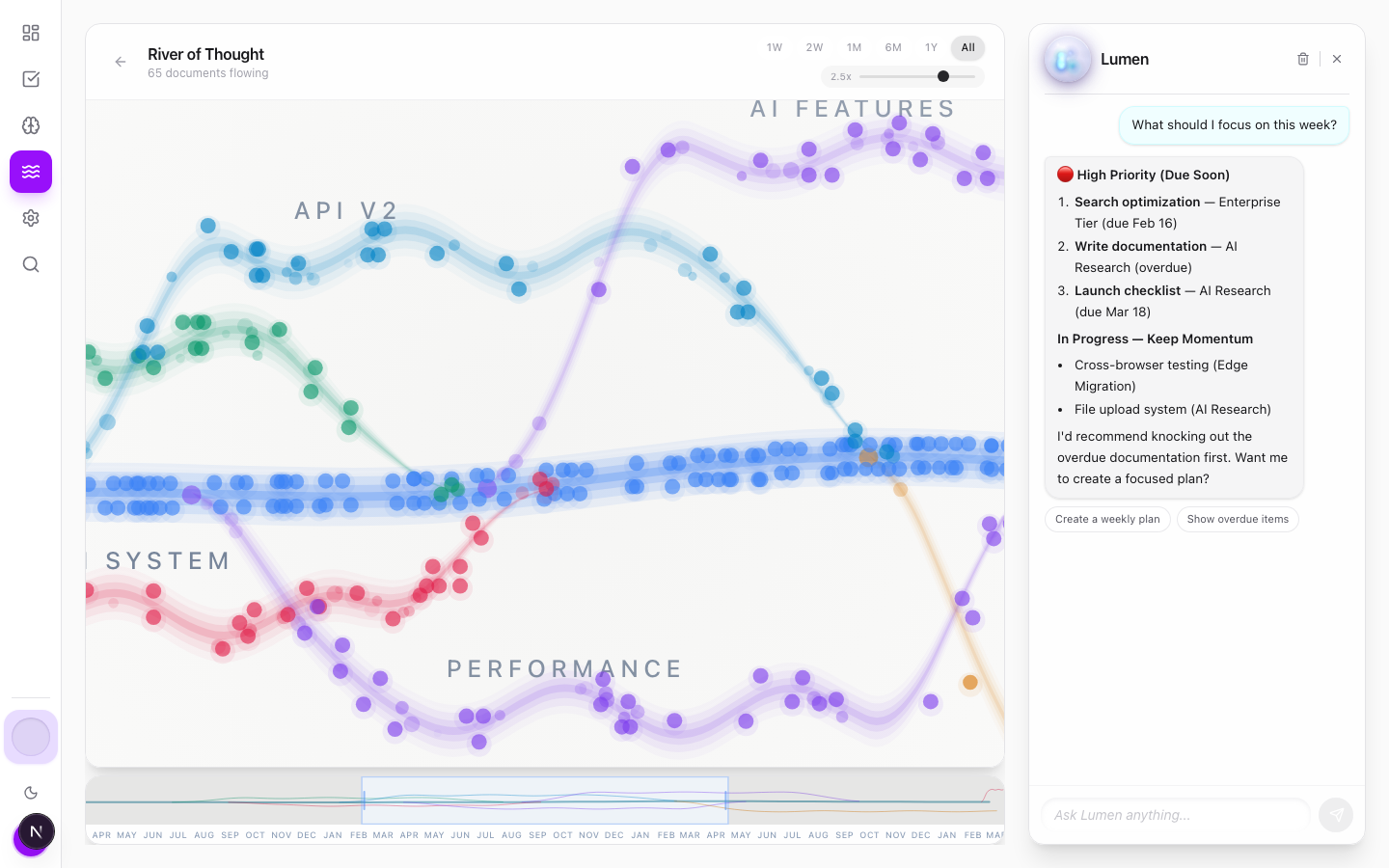See your knowledge base as a flowing river. Watch ideas branch, merge, and connect. The most beautiful way to understand how you think.