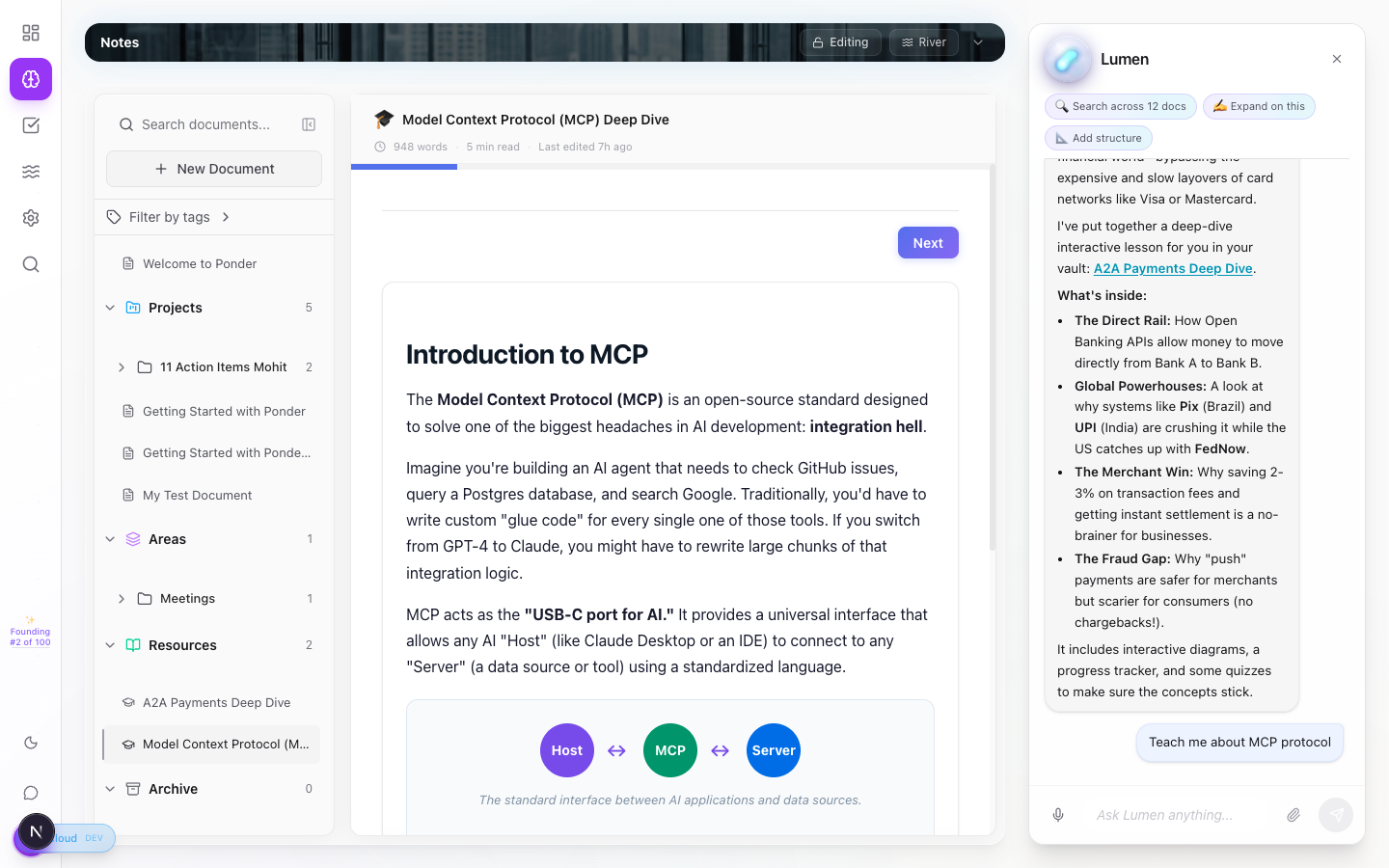 Say “Teach me about X” and Lumen creates an interactive lesson — with diagrams, quizzes, and progress tracking. Your second brain doesn't just store knowledge. It teaches it back to you.