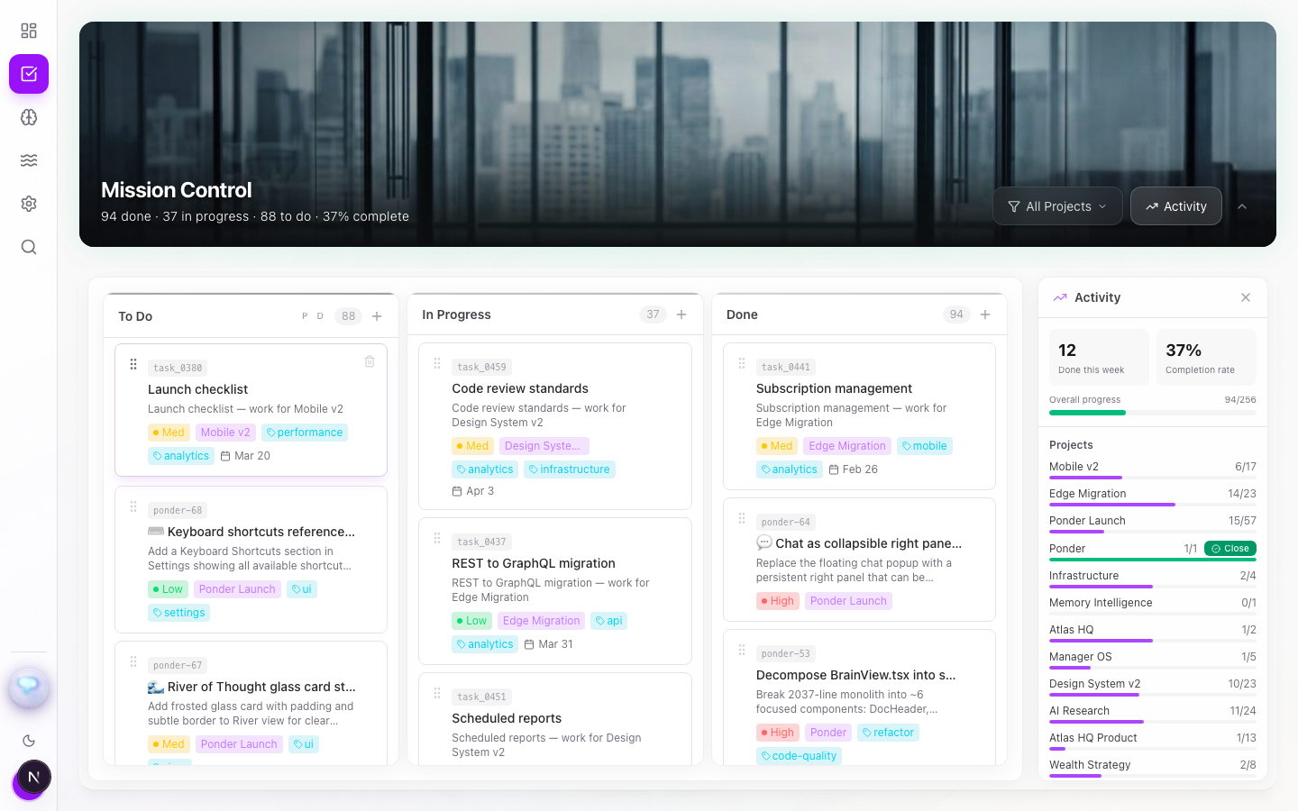 A kanban board that connects to your notes. Write meeting notes and PonderOS creates tasks automatically. Your notes become your to-do list.
